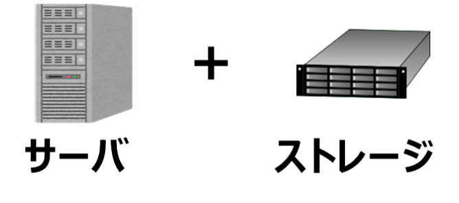 また、HWの差でいえば、サーバ筐体の本体に複数のディスクを搭載し、それらのディスクをSDS技術でまとめ上げることで専用のストレージ装置が不要となっています。