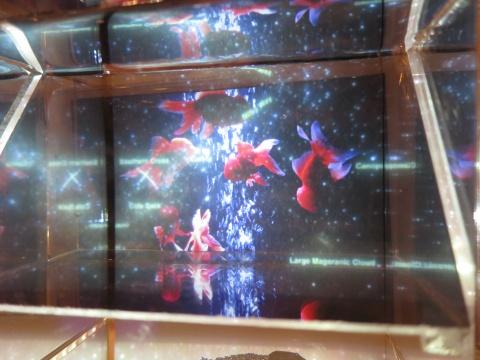 映像には、水中用には金魚の写真 (動画がなかったのが残念…)、後面の背景用には星空や宇宙からみた地球の写真などを出してみました。