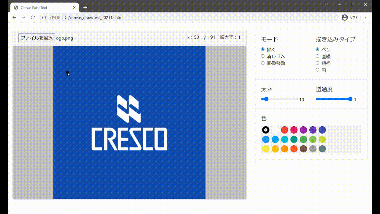 描き込みモード(ペン、直線、短径、円)、消しゴムモードそれぞれで処理を用意し、マウスイベントをトリガーにして各処理を呼び出しています。マウス移動イベントは連続して発生するため、各処理もそのたびに連続して呼び出す形となります。