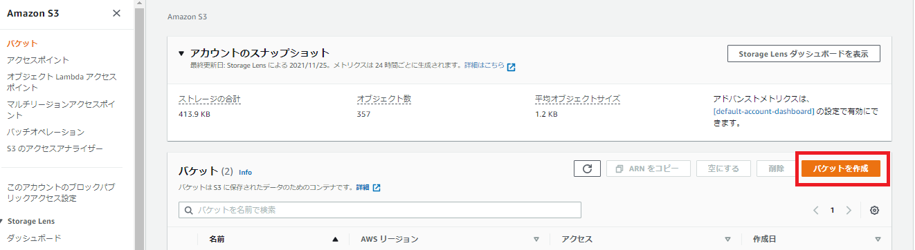 2-3.Terraformの状態管理をするファイルの保存先としてS3を作成します。S3のサービスコンソールから[バケットを作成]をクリックします。