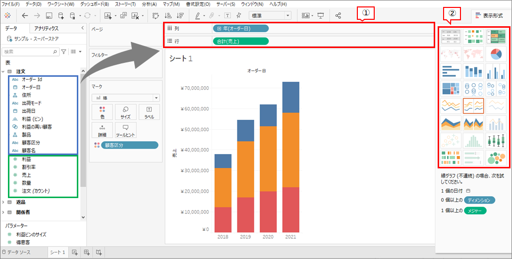 ①左にあるデータ欄から、項目をドラッグアンドドロップで列シェルフ、行シェルフに運びます。