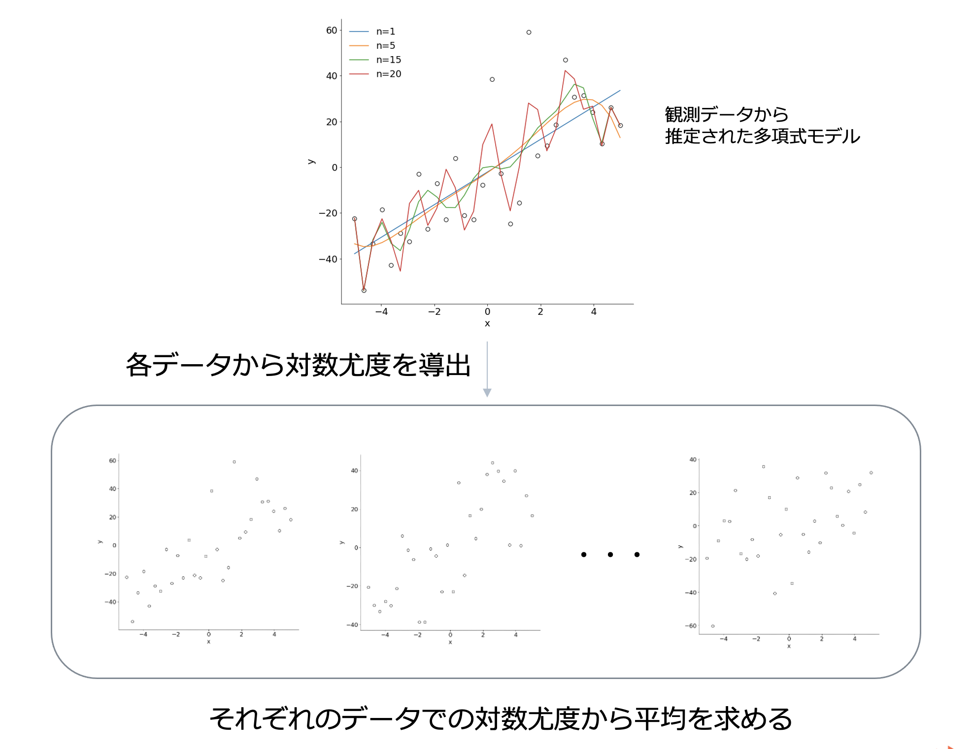 (現在のビッグデータ時代では大量にデータがある状態をイメージするかもしれません。確かに、大量のデータがあれば平均対数尤度を求めることは可能ですが、実用面ではデータが少ない場合の方が多いと思いますので、今回は少ないデータでも良いモデルを求める方法を考えることにします。)