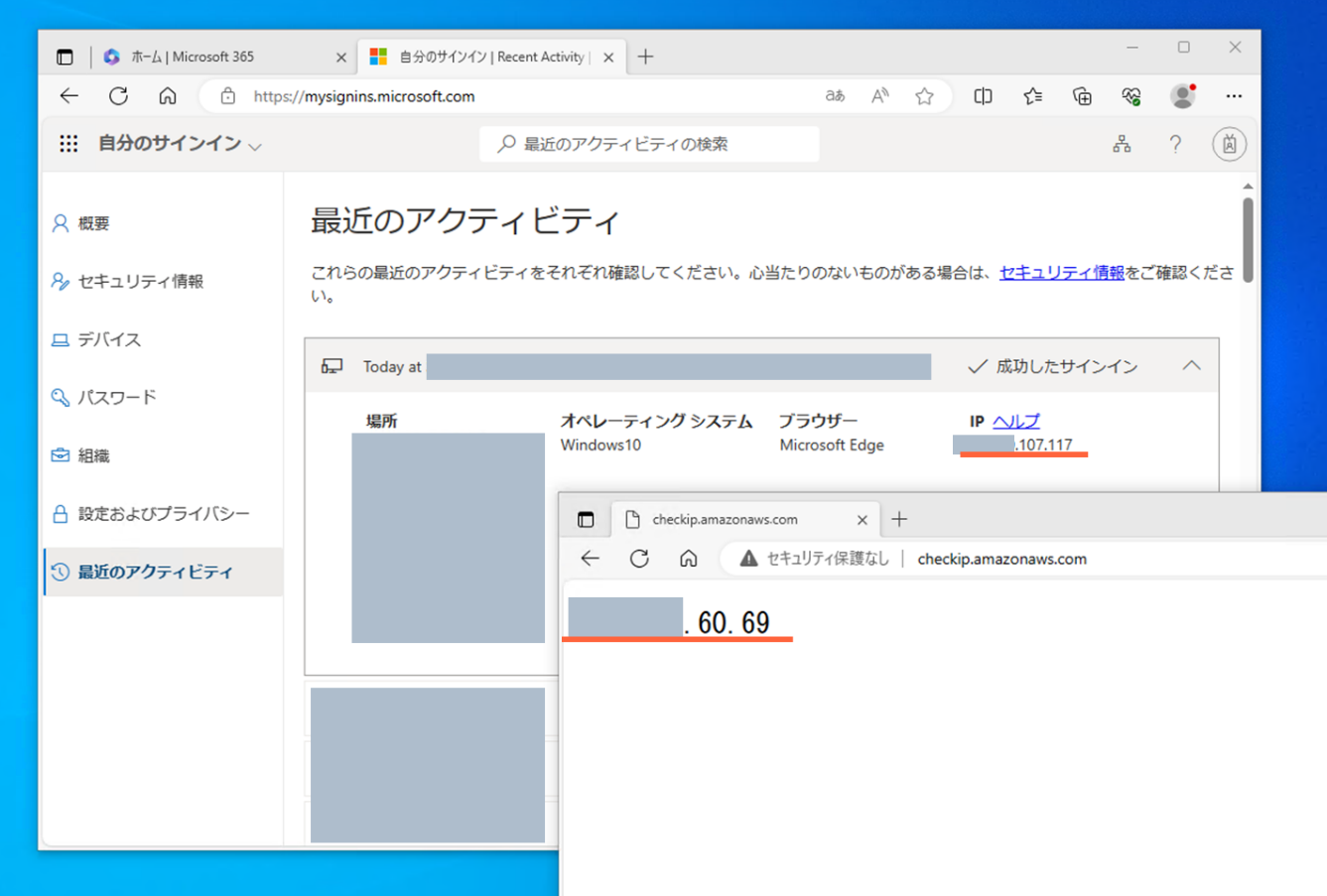 クラウド側で送信元のIPを確認するのは、Microsoft 365であれば以下URLか、「マイ アカウント」→「自分のサインイン」→「最近のアクティビティ」より確認可能です。