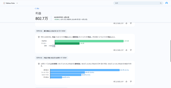 Tableau Pulseを使ってみた感想ですが、かなりメトリクス(指標)のウォッチに特化している印象でした。データを探索するというよりかは、業務上決まっているKPIを確認する等の用途に向いていそうです。KPIの継続監視はTableau Pulse(Cloud)、探索的分析はTableau Desktopの『Show Me 2.0』のように使い分けると良いのではないでしょうか。