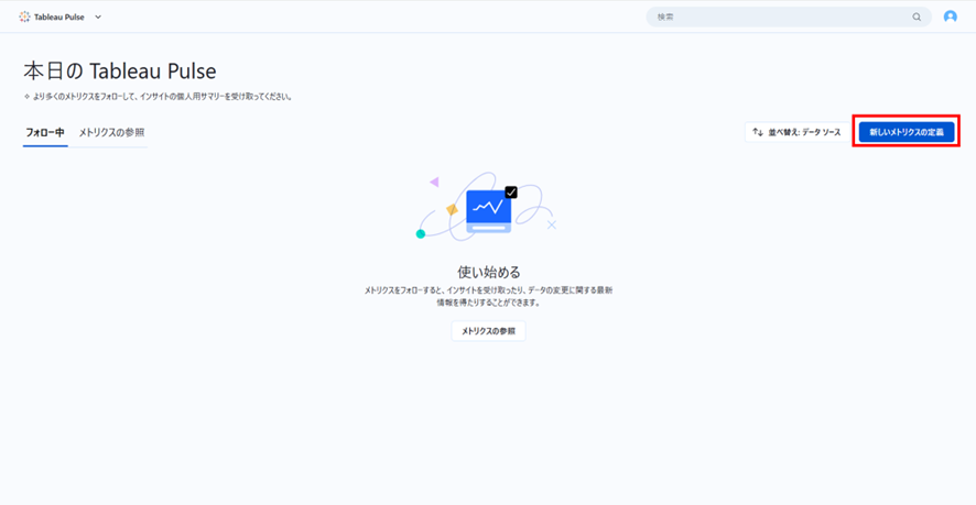 Tableau Pulseのホーム画面から、「新しいメトリクスの定義」を選択します。