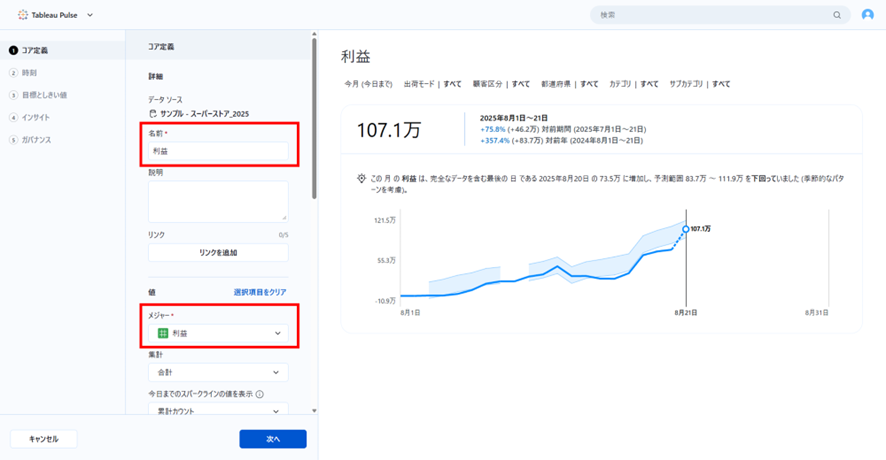 データソースを開き、①コア定義からウォッチしたい指標をメジャーに設定し、メトリクスに名前を付けます。ここでは仮に「利益」と付けましたが、ダッシュボードやデータソースと同様、Tableau Cloudを使用する組織内で判別できればなんでも良いです。