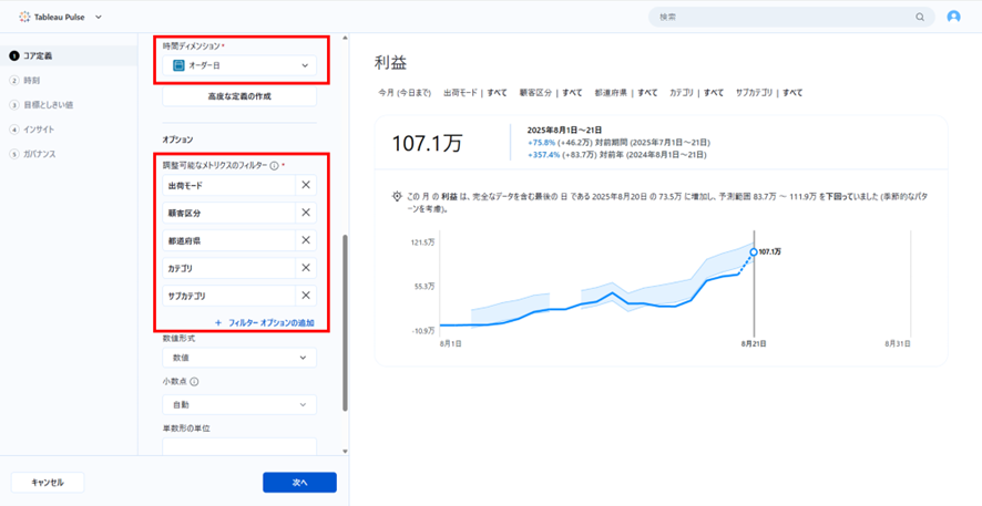 Tableau Pulseはあるデータの推移ウォッチに特化した機能であるため、日時/日付形式のディメンションを設定します。また、分析軸として使用したいフィルタをいくつか設定しておきましょう。