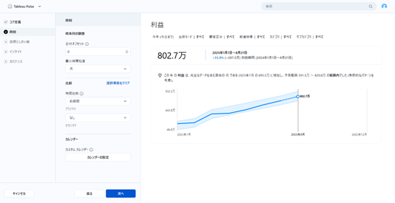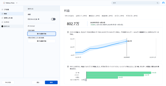 Tableau Pulseは、Tableau Cloudに追加されたAI駆動の機能で、時系列のKPI(本記事では『メトリクス』と呼びます)を継続的に監視し、異常検知やトレンドを自然言語(日本語対応)で提示します。BI専門知識がない方でも、業務KPIの把握と意思決定に活用できます。提供プランや有効化条件は環境により異なるため、最新の公式情報をご確認ください。