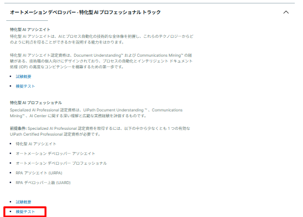 この資格は、UiPath製品の中でも「Document Understanding」、「Communications Mining」、「AI Center」といったAIに特化した製品の知識と活用スキルを問われる試験です。
