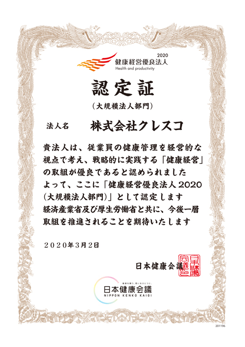 当社は経済産業省が共同で主催する「健康経営優良法人認定制度」に基づく「健康経営優良法人2020」に認定されましたのでお知らせいたします。