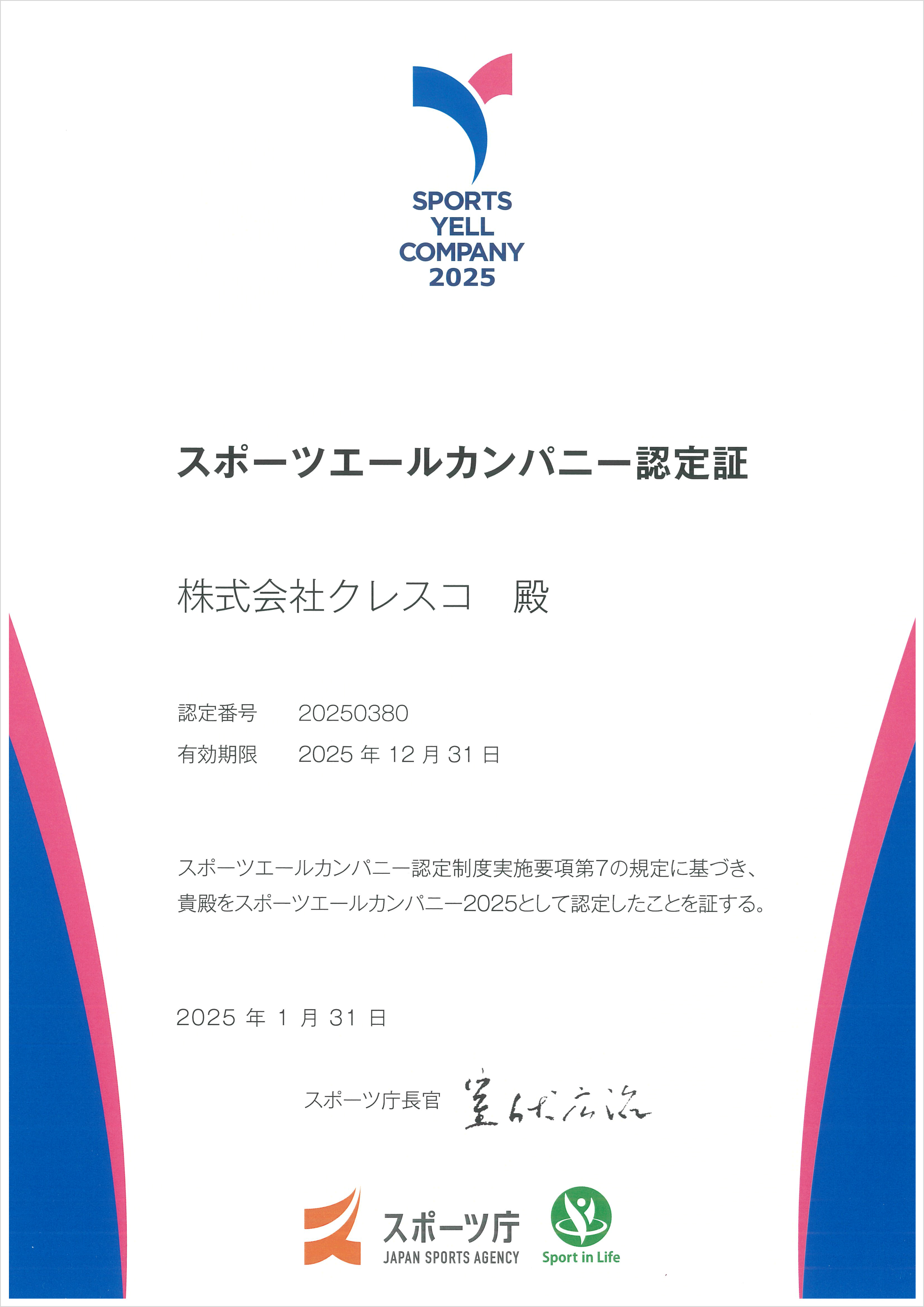 当社はこの度、スポーツ庁が認定する「スポーツエールカンパニー2025」に認定されました。「スポーツエールカンパニー」の認定は3年連続となります。