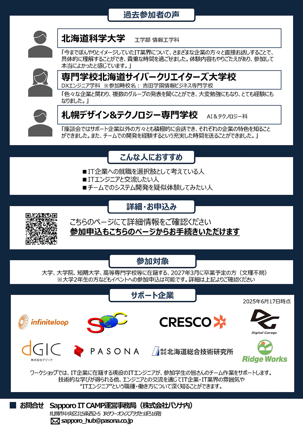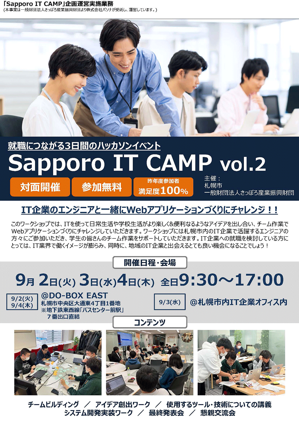 当社は、2025年9月2日(火)~4日(木)に開催された大学生や専門学校生向けIT体験イベント「Sapporo IT CAMP 2025」にサポート企業として参画し、地域のIT人材育成を支援いたしました。