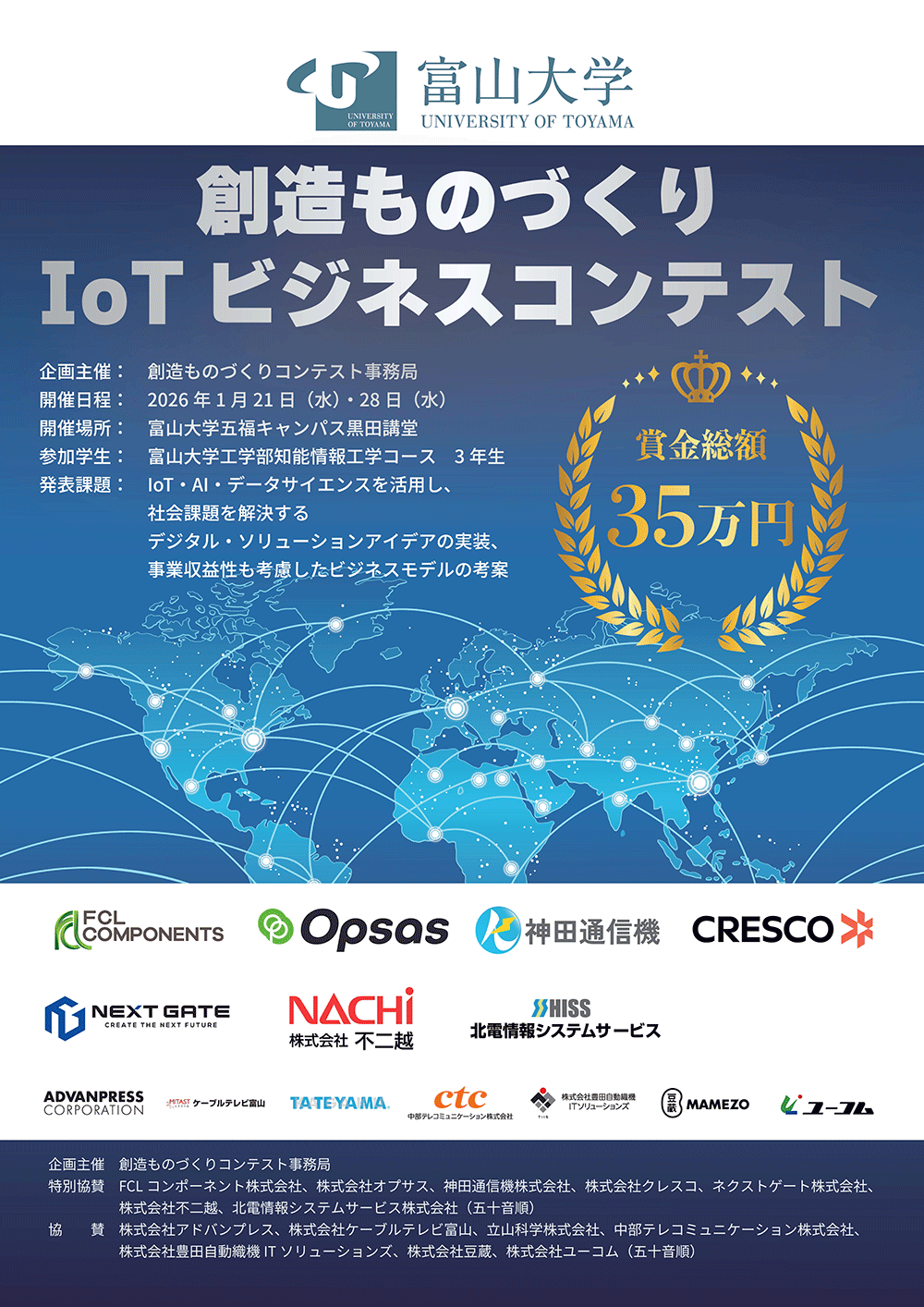 当社は、富山大学 工学部工学科 知能情報工学コースが開催する「創造ものづくりIoTビジネスコンテスト」(以下、「IoTビジネスコンテスト」)に特別協賛いたします。